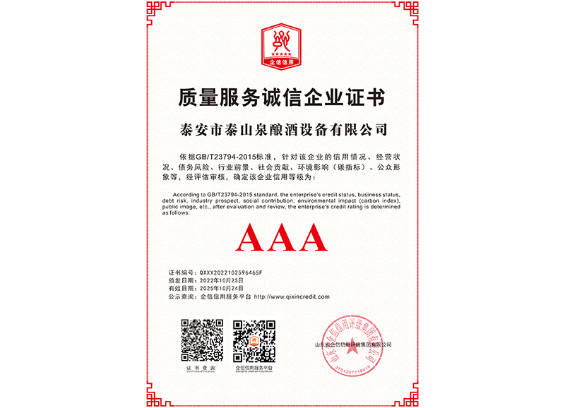泰安市泰山泉釀酒設備有限公司,是一家專業從事釀酒設備機械化研發并集技術咨詢,工程設計,制造安裝,人員培訓及售后服務為一體的綜合性企業,本公司主要產品為:大曲清香、小曲清香、大曲醬香、大曲濃香等香型白酒機械化設備?! ”竟九c中國科學院自動化研究所簽訂技術服務合同,引進先進技術,研究生產全自動化機械釀酒設備,由中國科學自動化研究所的技術支持,打造最先進的生產釀酒設備,公司有信心打造全國最先進白酒...